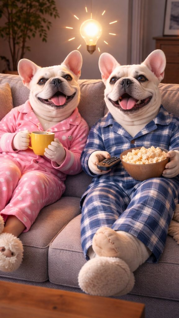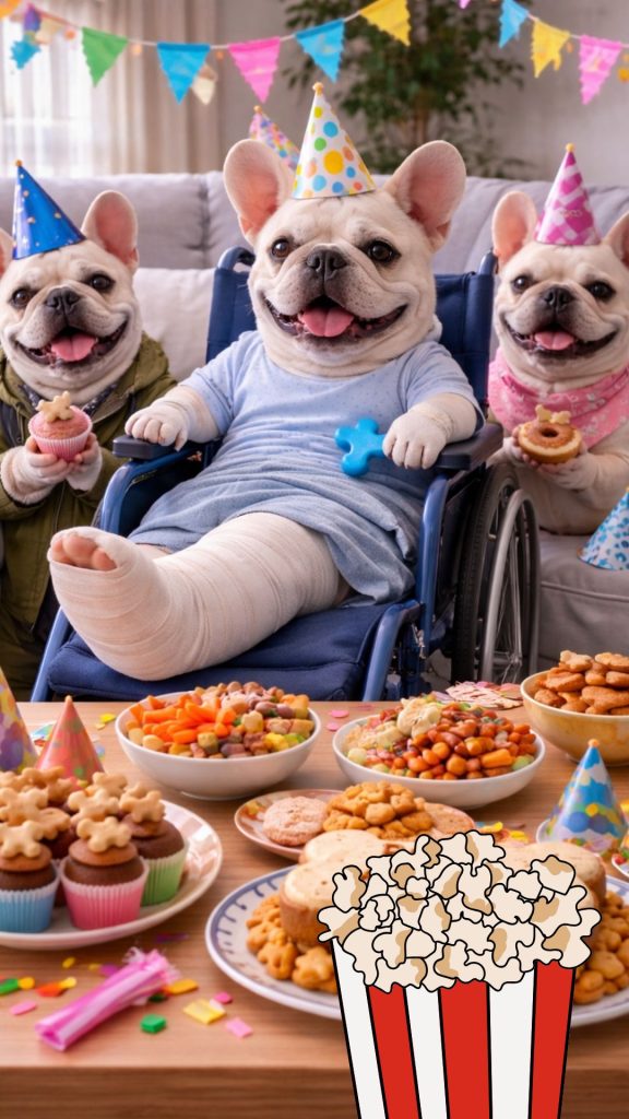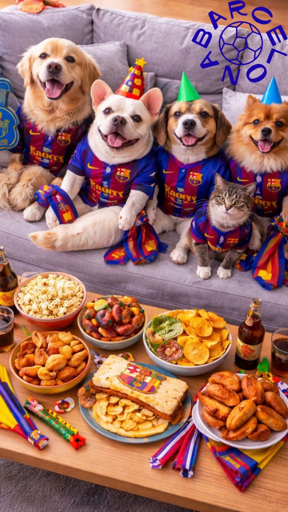 Die avond organiseerden ze een voetbalavond. Iedereen droeg dezelfde outfit, net zoals echte supporters. ⚽️ Skihuahua zat tussen zijn vrienden op de zetel, omringd door snacks, drankjes en lawaaierige toeters. 🎉