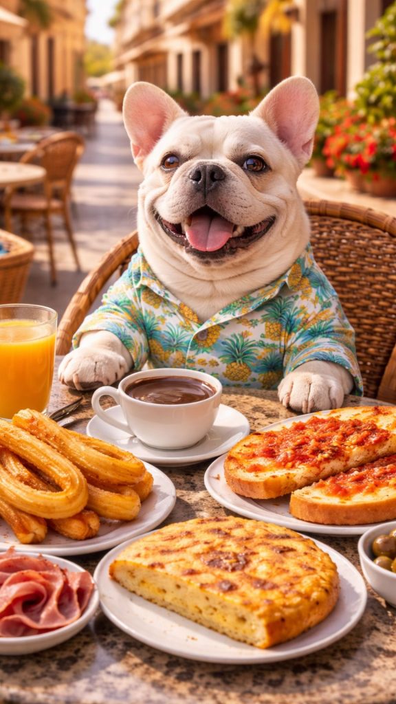 De volgende ochtend gaat Skihuahua samen met mama en papa gaan ontbijten. ☕️ Allerlei Spaanse lekkernijen worden hem voorgeschoteld.