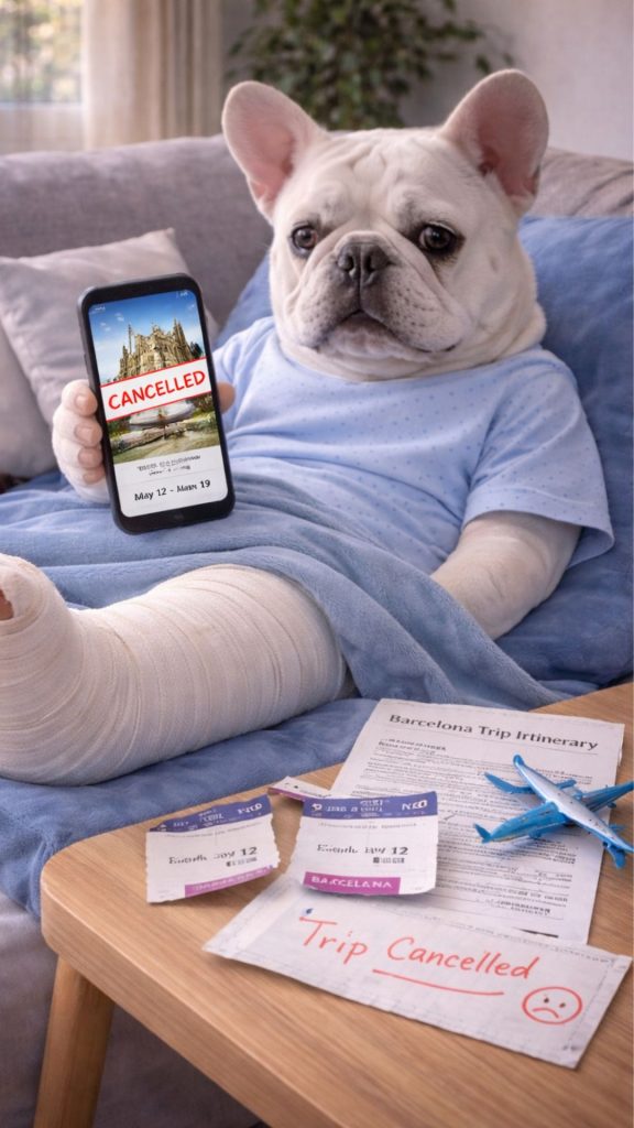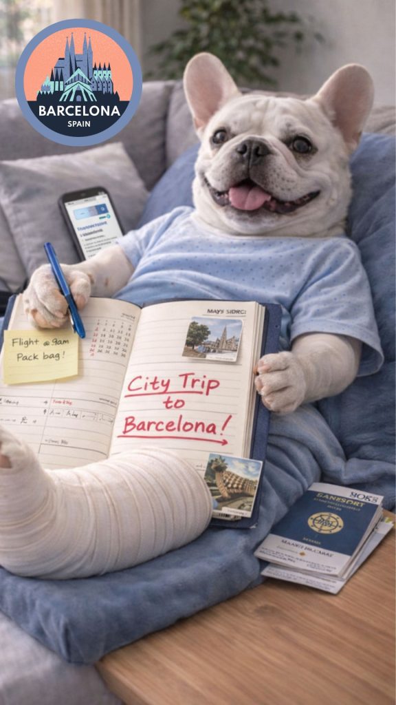 Onze Skihuahua keek al maanden uit naar zijn citytrip in Barcelona. Hij had alles gepland: zon, zee, cultuur en lekker eten. Maar net twee weken voor vertrek gebeurde het: krak!