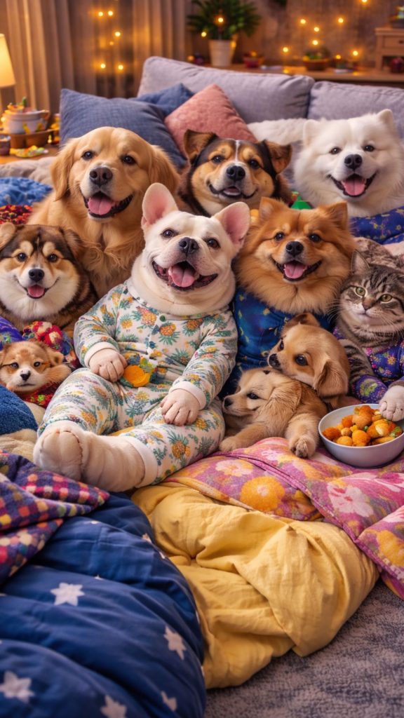 Een groot slaapfeestje met de nodige gezelligheid. 😴🐶🐶🐶🐱